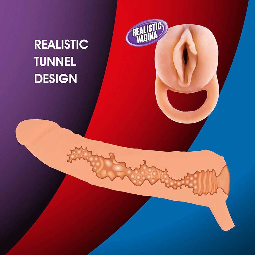 Fabricat din materiale de o calitate foarte bună, acest extender pentru penis este un adevărat 2 în 1. El poate fi folosit ca manșon/extender pentru penis, dar, datorită orificiului în formă de vagin, funcționează și ca un masturbator foarte realistic