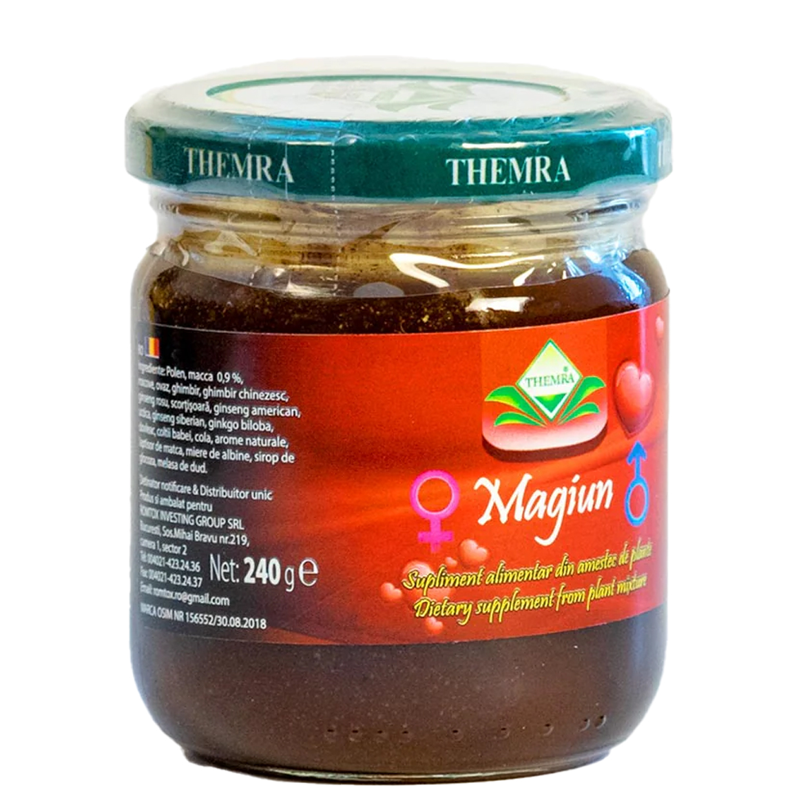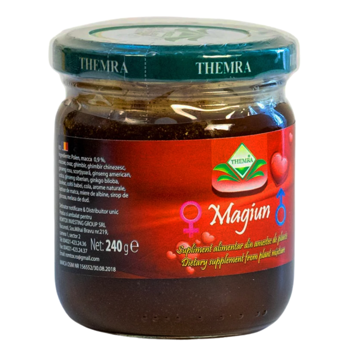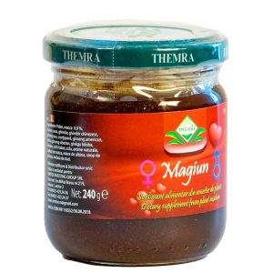 Suplimentul cu magiun afrodisiac Themra are o formulă naturală și este făcut din plante și extracte folosite de mult timp pentru a trezi dorința sexuală, a crește sensibilitatea și a face sexul mai plăcut. Ingrediente ca ginseng, ghimbir, Tribulus sau jeleu regal ajută sângele să circule mai bine și fac corpul mai receptiv.