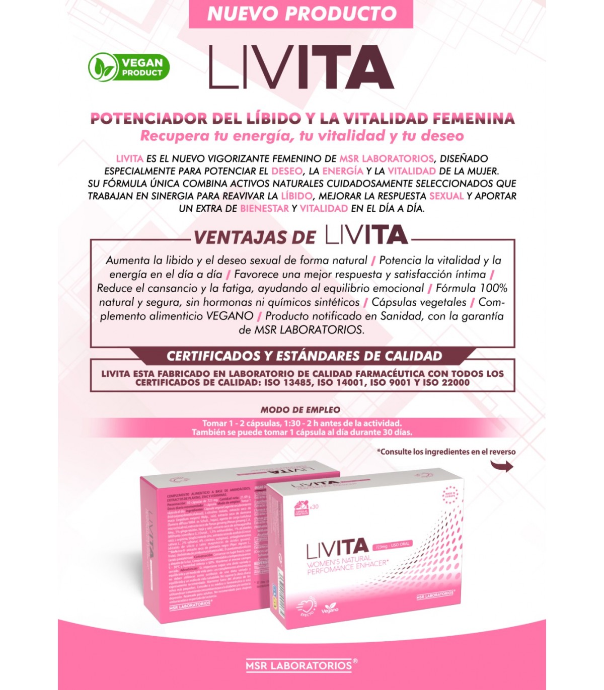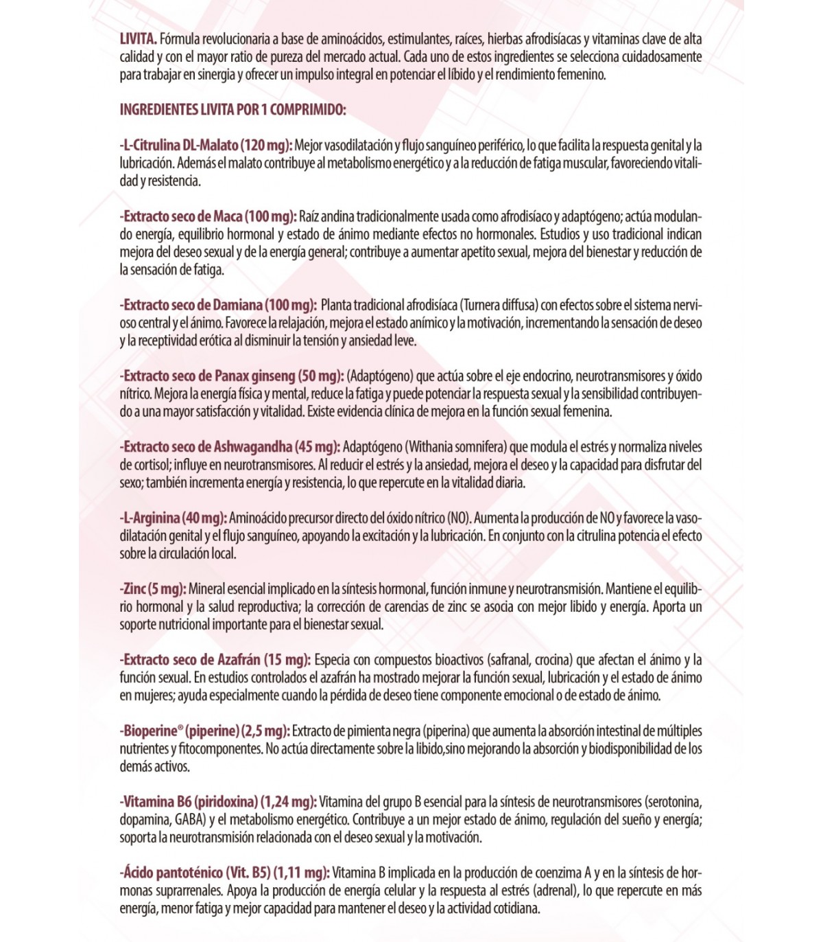 Livita se bazează pe un mix inteligent de extracte vegetale (precum Maca, Muira Puama sau L-Arginină) care acționează pe două fronturi: