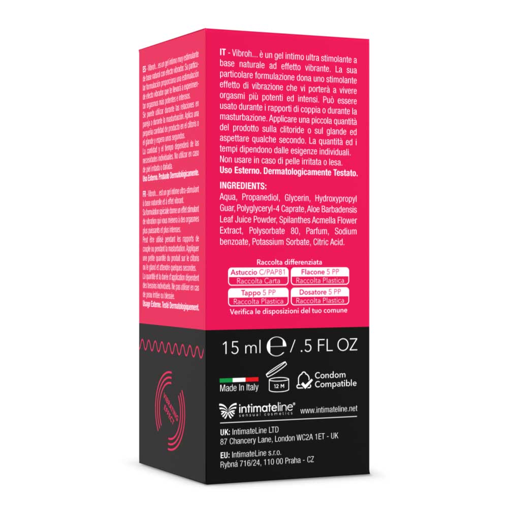 Vibroh este un gel intim pentru femei, ultra-stimulant cu bază naturală și efect de vibrație. Formula sa și ingredientele speciale din compoziția sa oferă un efect de vibrație stimulant, care va genera experiențe cu orgasme mai puternice și intense.
