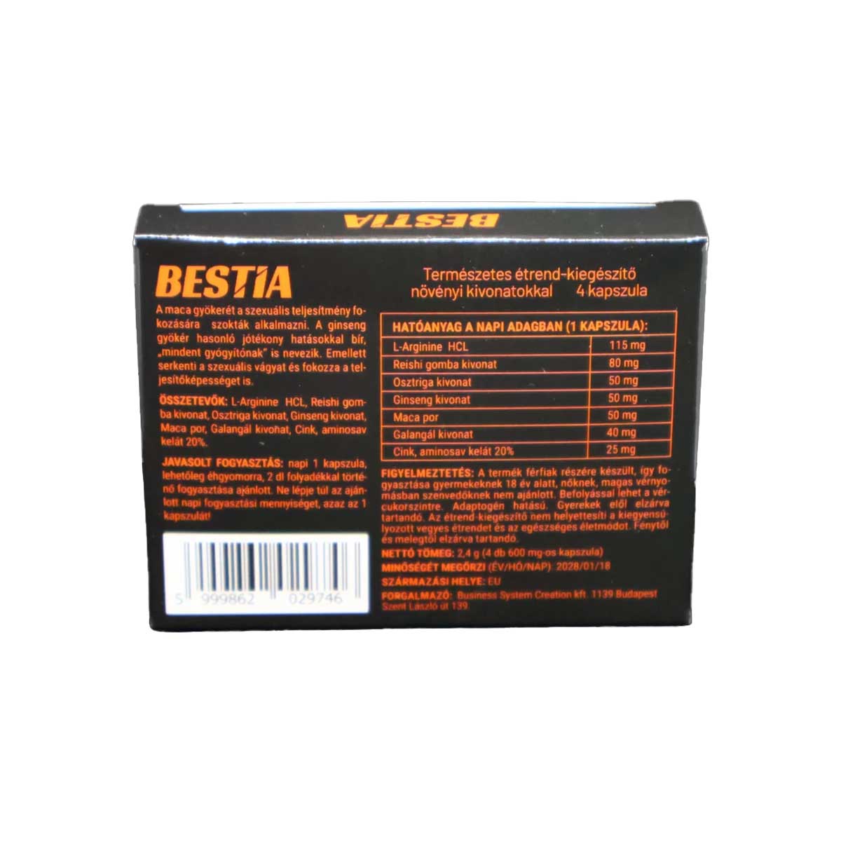 - O singură capsulă de BESTIA conține un mix optim de L-Arginină HCL (115 mg) și extract de ciupercă Reishi (80 mg), compuși esențiali pentru dilatarea vaselor de sânge și oxigenarea celulară.