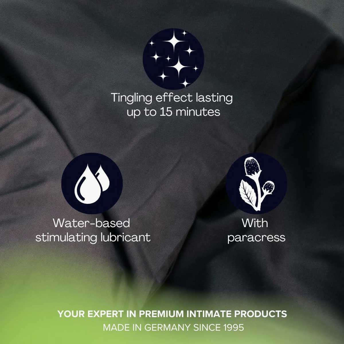 Doar câteva secunde sunt suficiente pentru a simți efectul său cu furnicături. Complexul activ cu Spilanthes acmella acționează natural asupra pielii, crescând sensibilitatea și intensificând fiecare atingere.