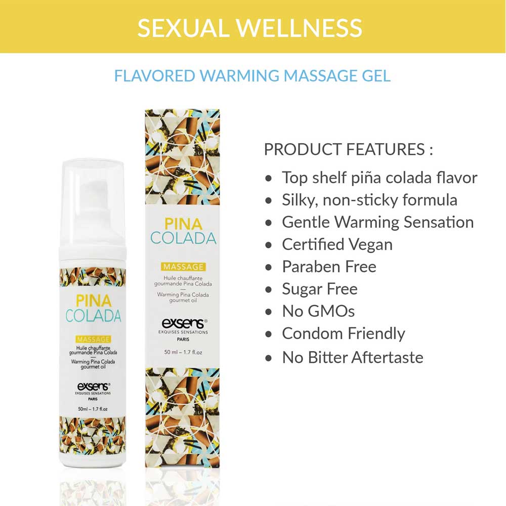 Răsfață-te cu plăcere cu uleiul nostru de masaj erotic cu Pina Colada, un produs de masaj de lux care are efect de încălzire și este ideal pentru preludiu dar și pentru tot parcursul jocurilor erotice. Când este aplicat pe zonele intime (clitoris, labii, penis, sfârcuri etc), va genera o senzație ușoară de încălzire care vă va face pe amandoi să vă simțiți extraordinar. De asemenea, aroma sa delicioasă și faptul ca este un gel comestibil îl face perfect pentru atingerile și plăcerile orale.