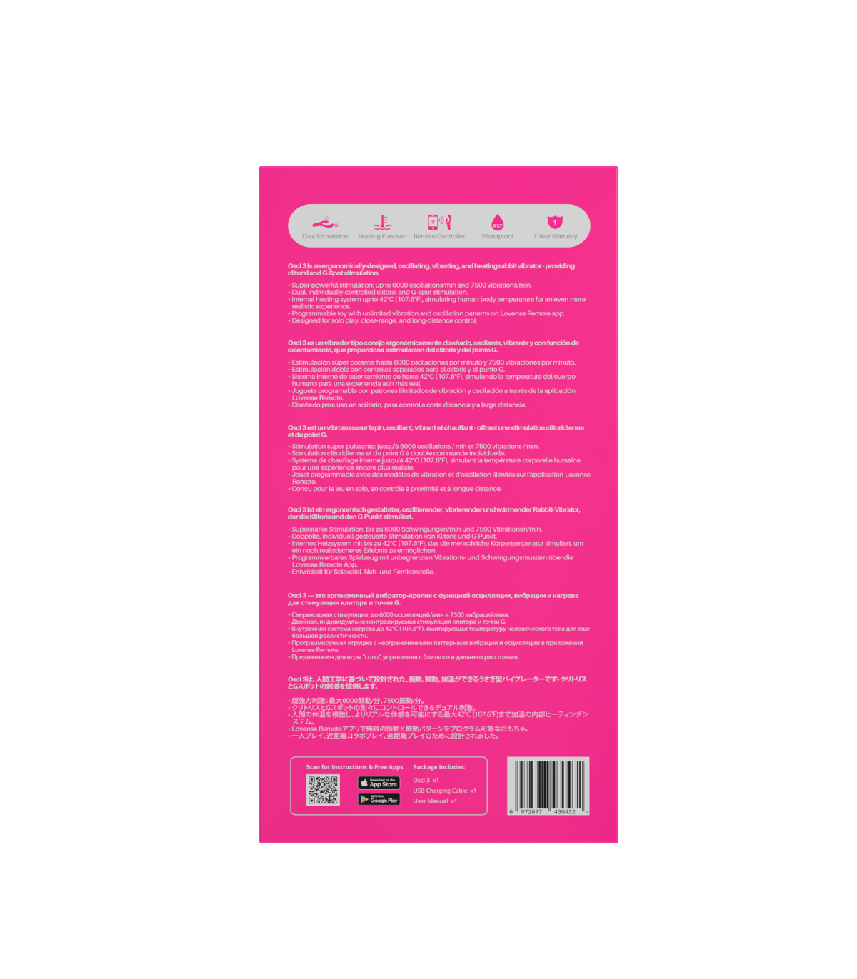Osci 3 de la Lovense este un vibrator de tip rabbit, creat pentru persoanele care caută o experiență orgasmică, cu stimulare dublă și senzații variate într-un singur dispozitiv. La prima vedere pare un produs compact și bine echilibrat, însă valoarea lui reală vine din combinația dintre mișcarea oscilantă, vibrațiile puternice și funcția de încălzire, toate lucrând în același timp pentru o experiență mult mai realistică decât în cazul vibrațiilor clasice.