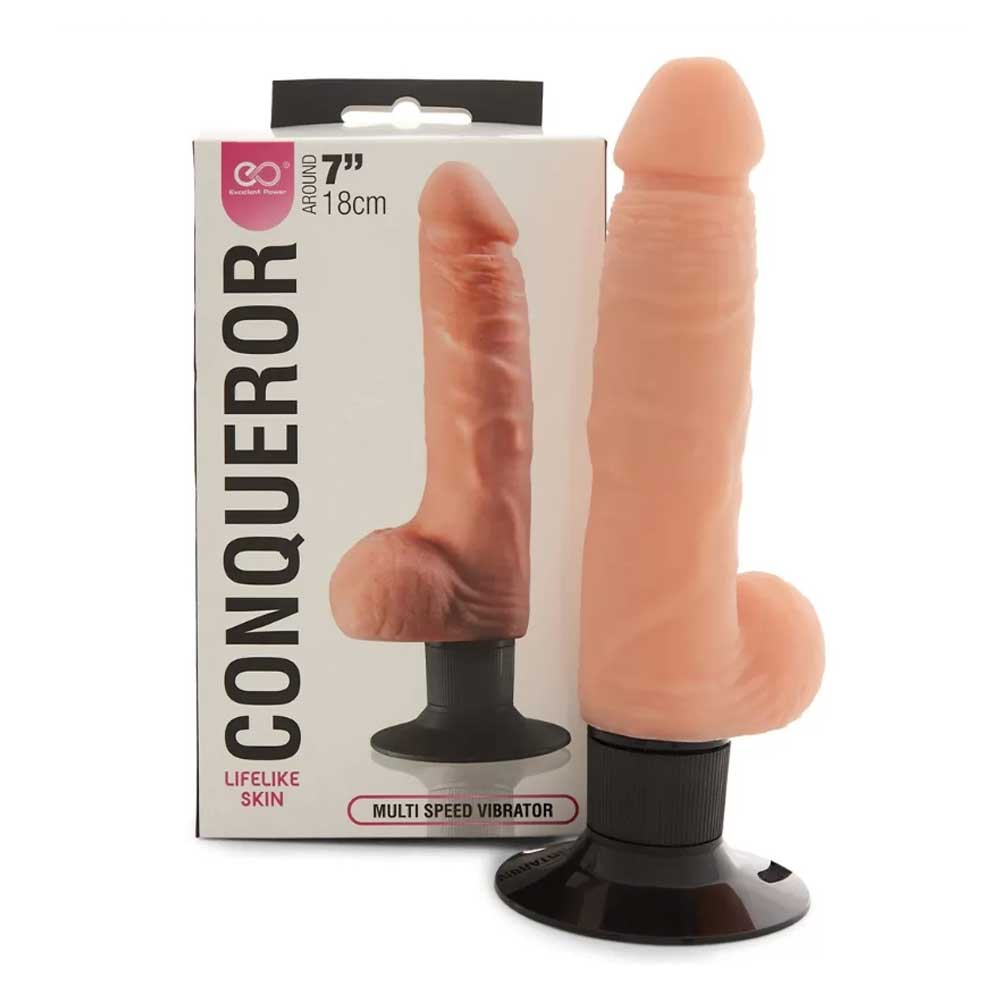 Conqueror este un vibrator realistic, în formă de penis mare, frumos și gros, fabricat dintr-un material cu textură asemănătoare pielii, cu funcție de vibrație reglabilă, suprafață venoasă și completat cu testicule. Produsul este ușor de utilizat și se poate fixa pe suprafețe netede datorită ventuzei.